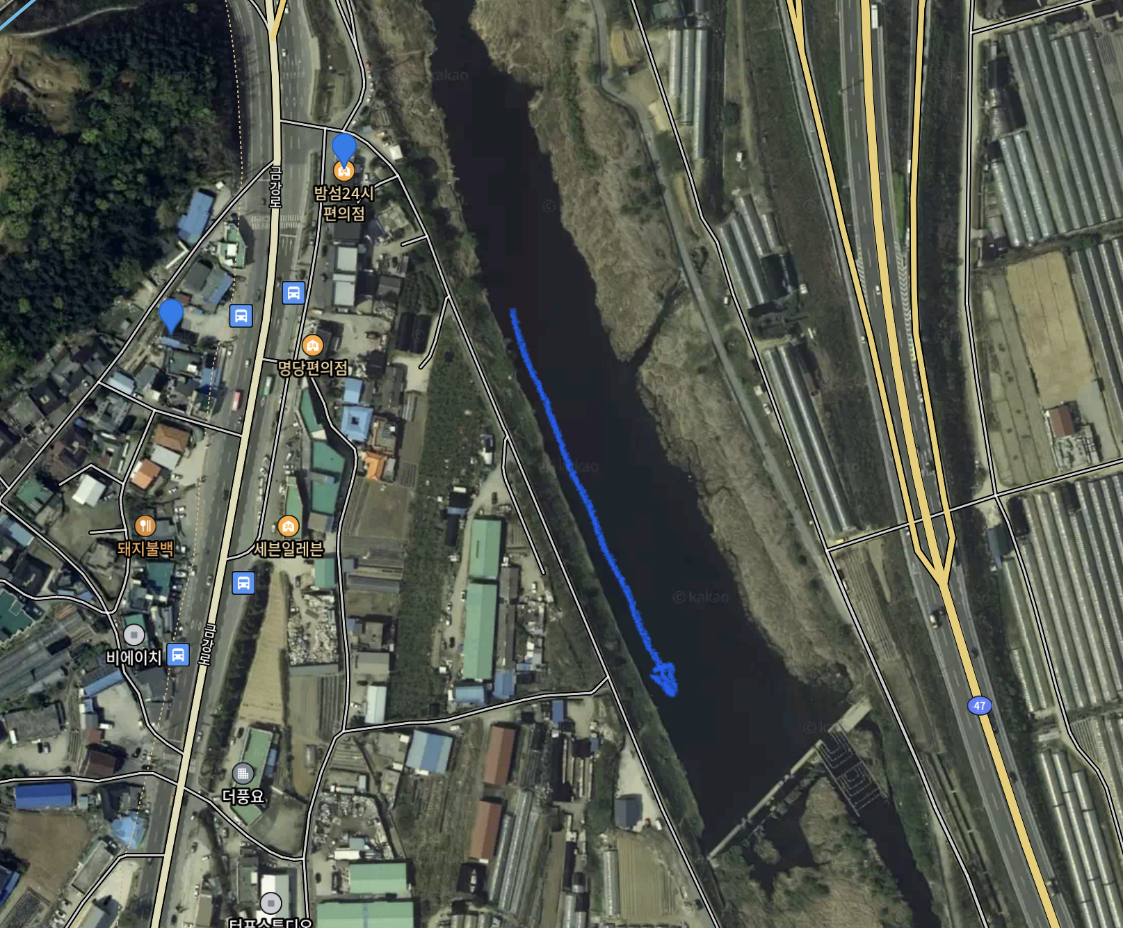 대강 가까우면서 위성지도 상에 괜찮아 보이는 포인트를 검색해서 온 곳은 #밤섬유원지 아래 #내곡교 라인이다. 이때는 #산란기 였기 때문에 위 사진의 파란색 라인을 따라 쉘로우에 #산란장 을 차렸을 것 같았다. #편광 #선글라스 를 가져오지 않아 아쉬웠지만 나는 매의눈이니까 해볼만 할 거라 생각하고 진입! 스베로 간단히 탐색하며 쭉 내려가 보지만 역시나 입을 열지 않는 다.
