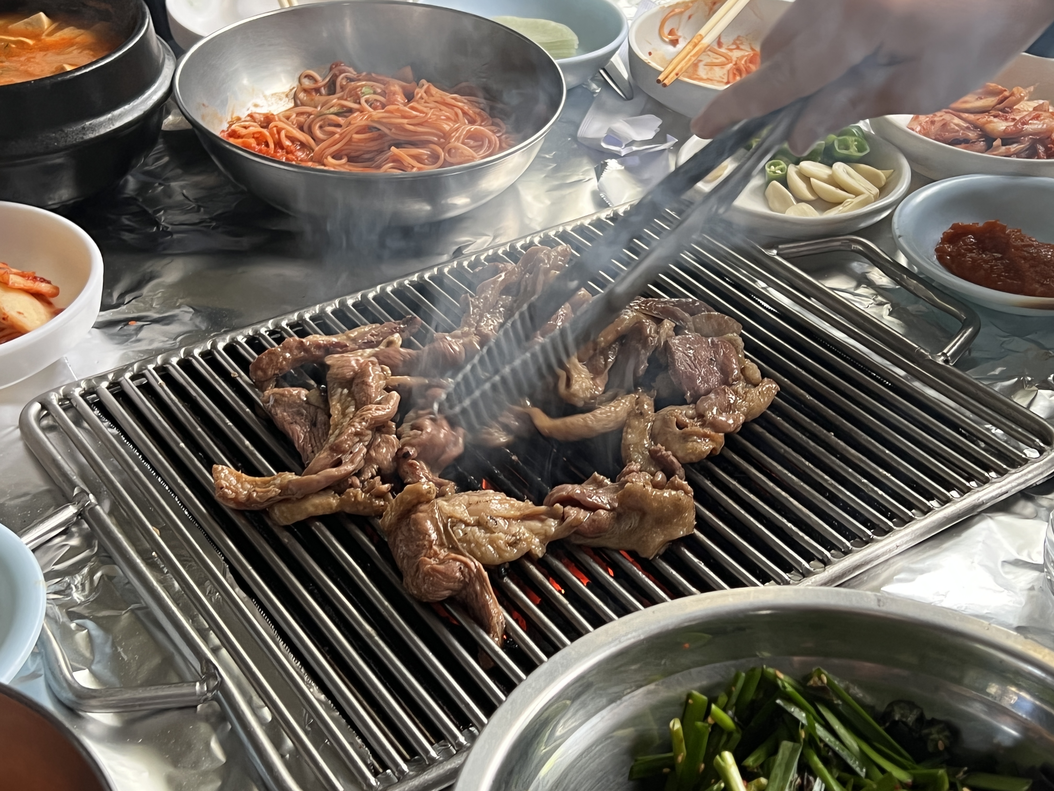 나오자 마자 굽기 시작. 양념된 고기를 석쇠에 굽는 게 제일 힘든 나는 잘하는 친구에게 맡김.ㅎㅎ 타지 않게 부지런히 솎아주니 불향도 느껴지고 익힘정도도 너무 좋았다. 비빔국수에 육쌈냉면처럼 싸서 먹으니 크아 밸런스 오졌다. 적절히 매운 비빔국수 양념+달큰한 오리구이가 조합이 괜찮았다. 친구가 괜히 추천한게 아니었음.