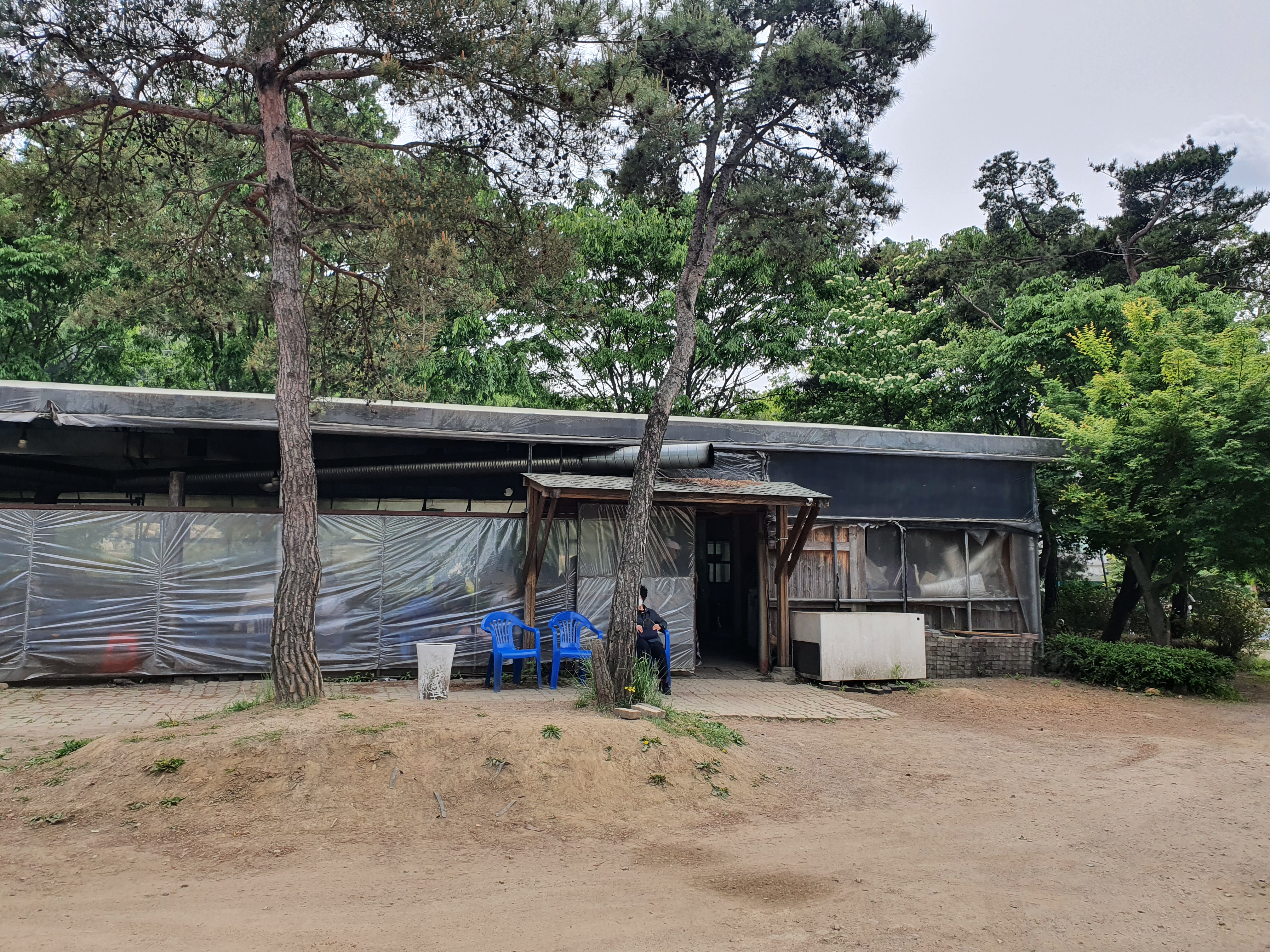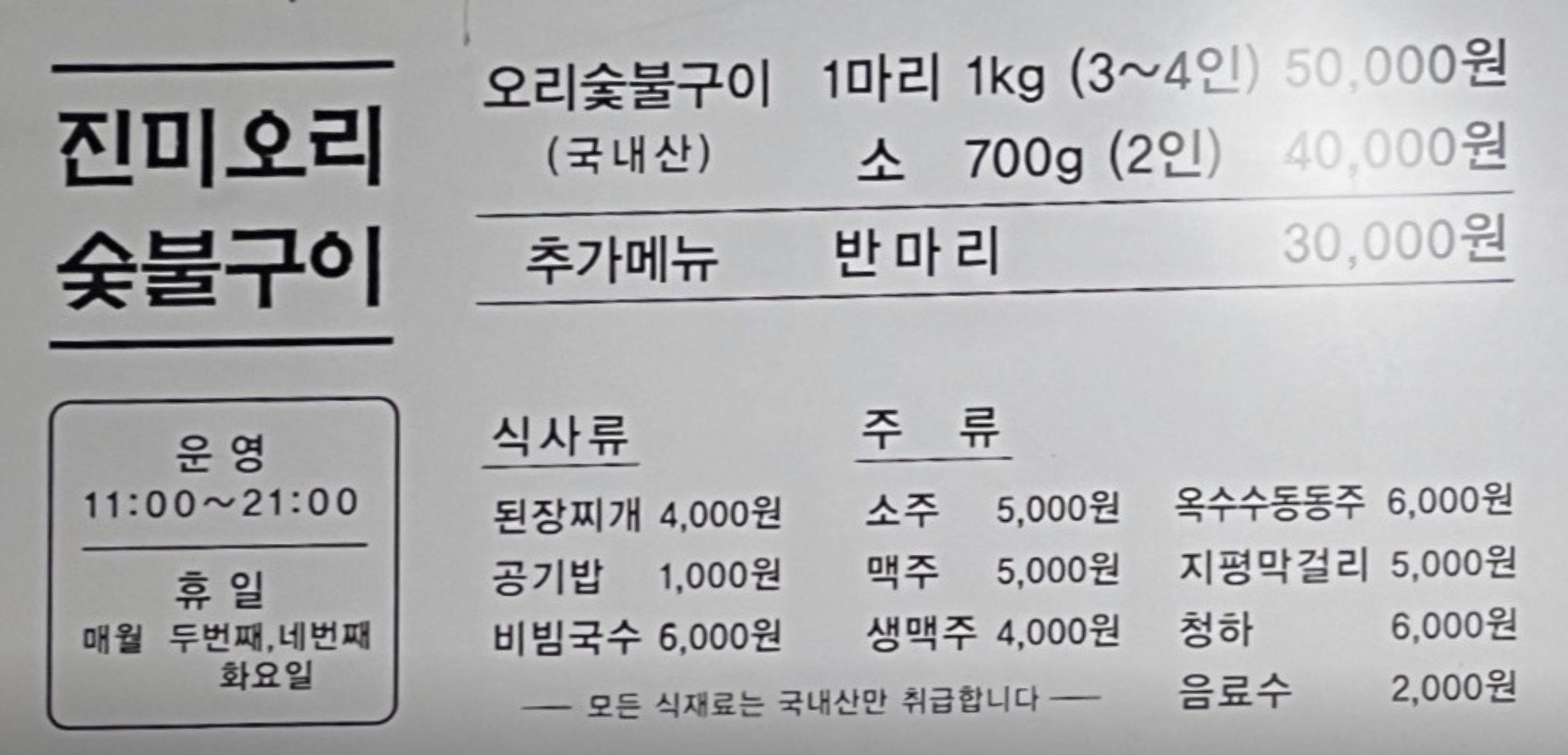 약속 장소는 #진미 #오리구이 다. 일단 주차장이 넓어서 너무 편했고, 본관 건물은 운영을 안하는 것 같고 이 야외 취사장에서 영업이 이루어지는 것 같다. 아주 작은 천 옆에 만들어놓아서 분위기는 좋아 보였다.
