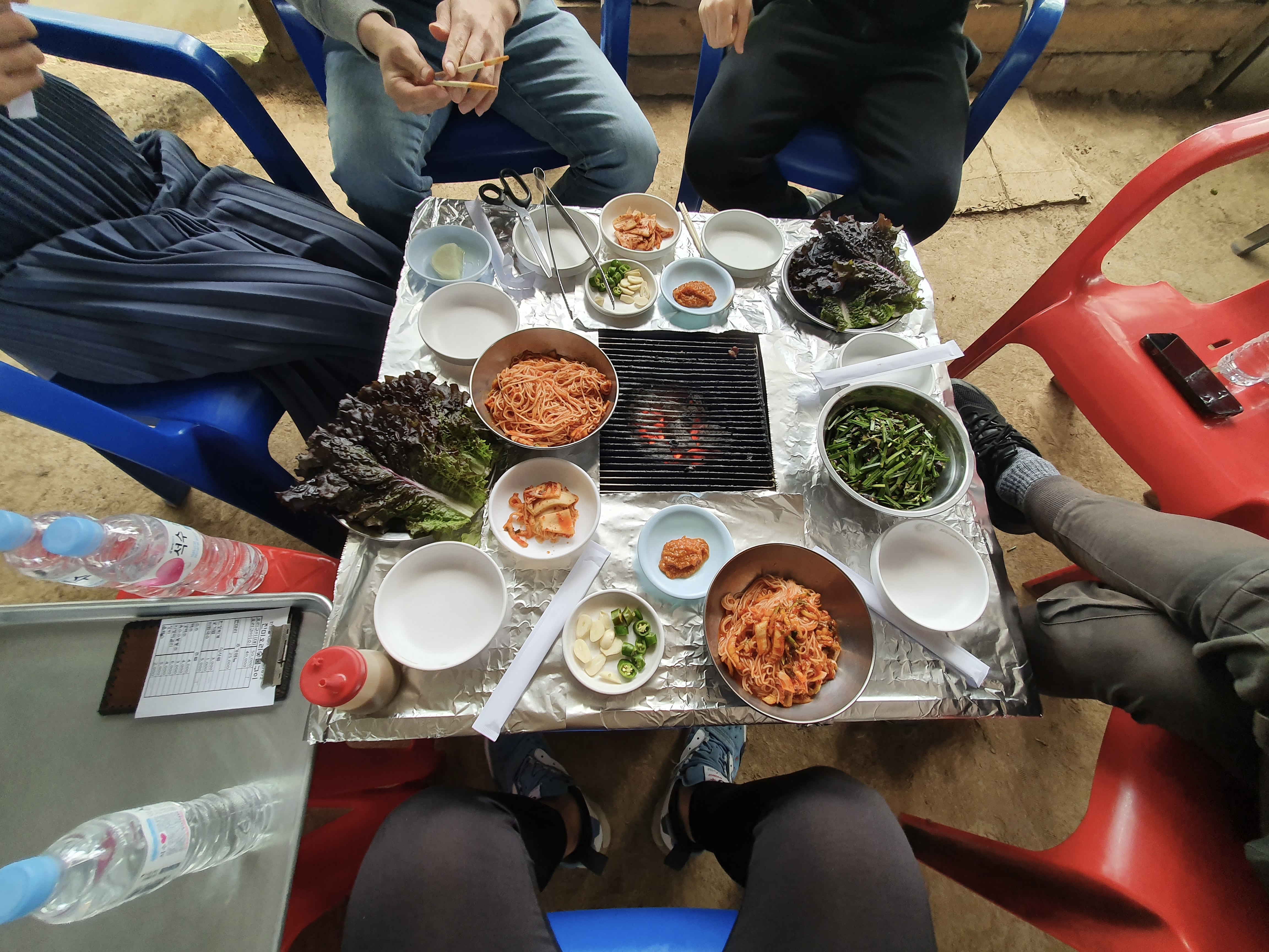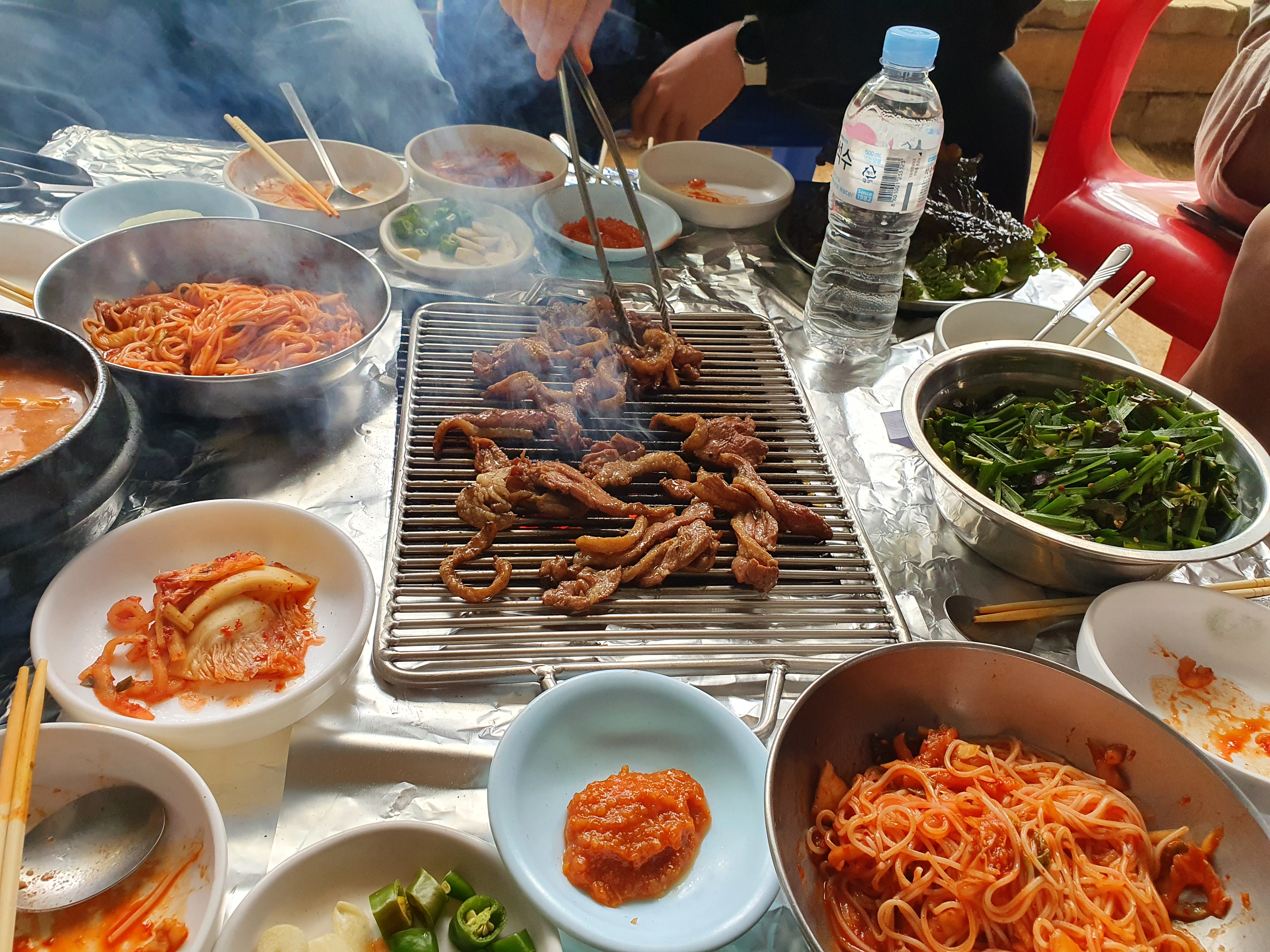 비빔국수가 먼저 나오고 바로 세팅. 밑반찬을 먹어보니 여기구나 싶었다. 메인이 오리구이이니 기본찬이 좀 약해보이지만 정석적이지 않나 싶다. 일단 답답하고 연기 자욱한 실내 보다는 나은 듯? 통풍 잘되도록 문을 전부 열어놔서 그나마 연기가 많지 않았던 느낌이다.